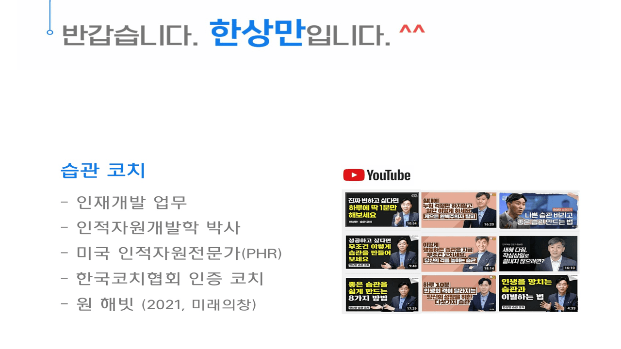 한상만 선생님은 삼성서울병원에서 20년 이상 인재개발 업무를 맡아온 전문가입니다. 중앙대학교 인적자원개발학 석사 및 박사과정을 이수하셨으며, 다년간의 연구와 현장 경험을 바탕으로 쉽지만 강력한 습관 전략을 체계화하고 이를 기반으로 여러 권의 저서를 집필하셨습니다. 이번 강의는 한상만 선생님의 풍부한 경험과 깊이 있는 통찰이 담긴 의미 있는 시간이 될 것 같습니다.
